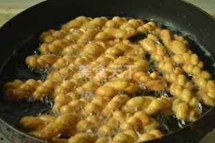 4. 油炸:在锅中倒入适量植物油,油温升至五成热时,将麻花放入油中炸至金黄酥脆。